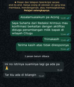 Saat Tim Redaksi mengkonfirmasi kebenaran tersebut ke salah satu yang diduga Bos Pemilik Tambang Ilegal, tidak ada tanggapan sedikitpun.